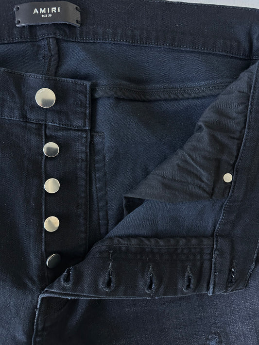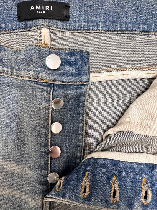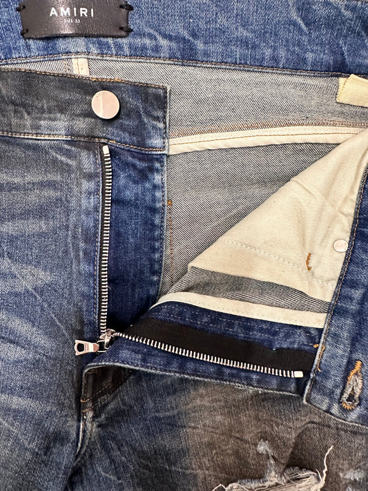 Amiri Dirty Indigo Cashmere Patch MX1 Distressed Denim Jeans